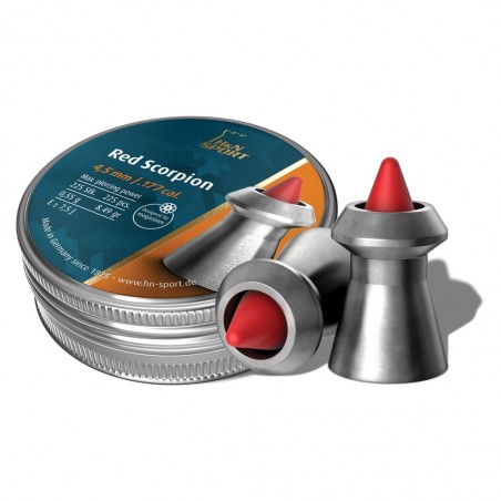 De H&N Red Scorpion 4,5 mm luchtbukskogel is voorzien van en harde en scherpe punt van polymeer die verwerkt zit in een hollow point. Ideale combi voor diepe penetratie en maximale vervorming. Echte hunter die grote gaten maakt. 225 stuks.