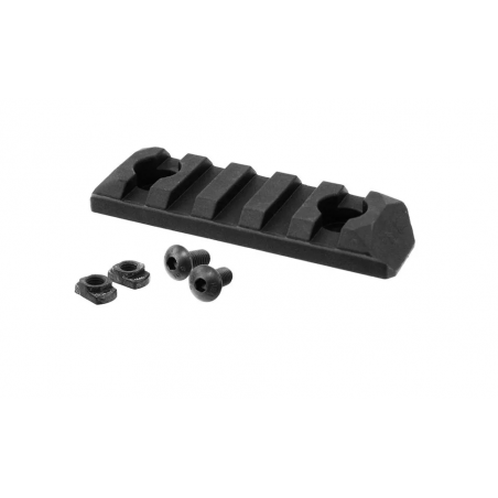 De low profile PTS M-LOK 5 slots black Picatinny rail is eenvoudig en stevig te bevestigen aan een M-LOK systeem en is voorzien van vijf sleuven. De uiteinden zijn afgeschuind, zodat de rail beduidend minder kans heeft ergens achter te blijven haken.